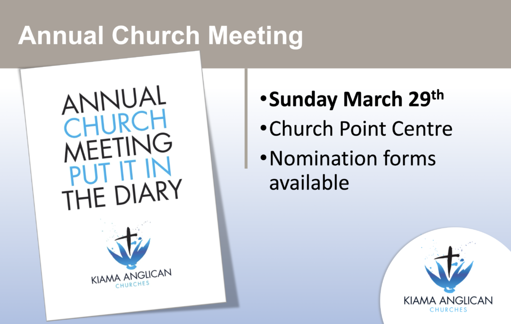Next Month Annual General Meeting – Sunday March 29 Kiama Anglican - February 22, 2020February 28, 2020 2020 Nomination Form – Print this out at home